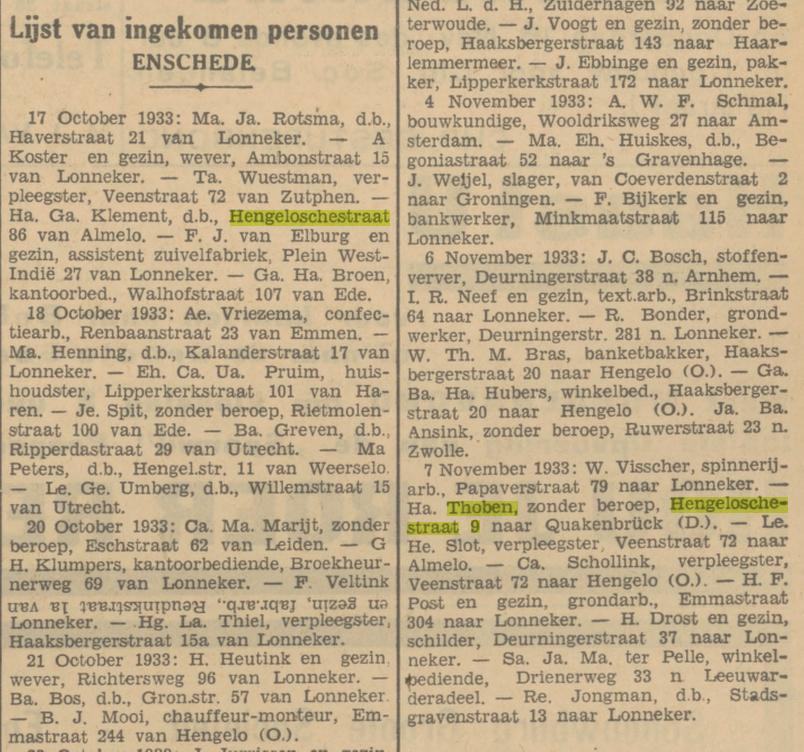 Thoben Mej. A. gezelschapsdame Hengelosestraat 9 krantenbericht 14-11-1933