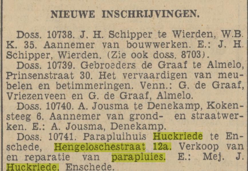 Huckriede Mej. Joh. winkel in parapluies Hengelosestraat 12a krantenbericht 10-2-1937 advertenties 9-6-1967 en 8-11-1968