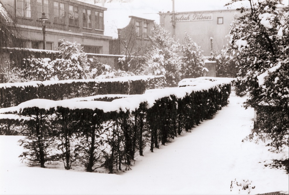 Hofstraat 6 Zicht op de stadhuistuin bij het stadhuis in de sneeuw. achtergrond beeld Belgische vluchtelingen  cafe Dam maart 1955.jpg