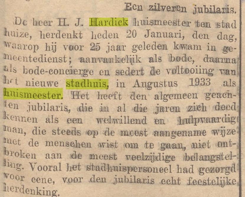 Hardiek H.J. huismeester Stadhuis Hofstraat 16 krantenbericht 20-1-1938