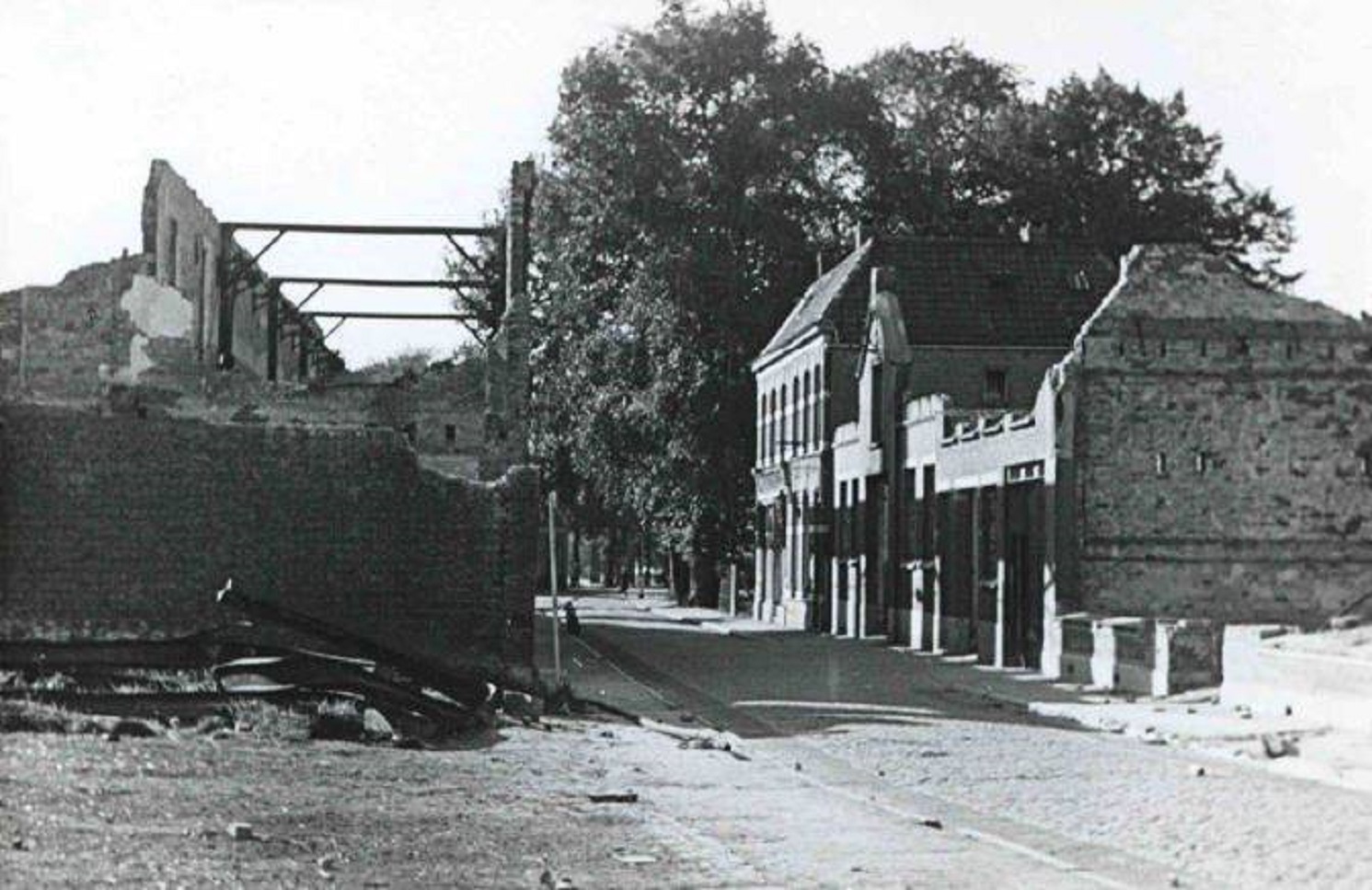de oude foto is gemaakt op kruispunt De Graaff, waar toen nog panden met afgeronde hoeken stonden.