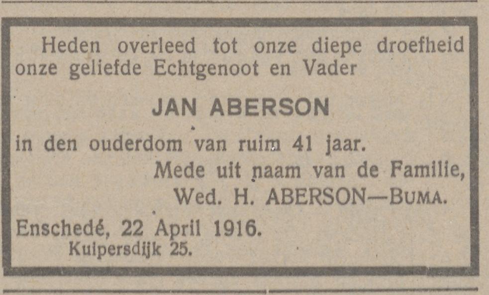 Aberson-Buma Wed. H. Kuipersdijk 25 advertentie 29-4-1916