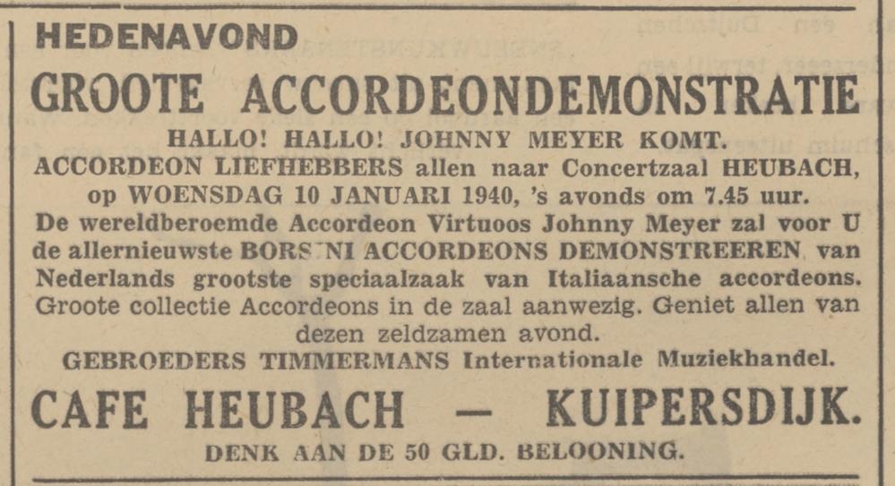Heubach W.Joh.B.M. caféhouder Kuipersdijk 50 advertentie 9-1-1940 en krantenbericht 5-6-1950