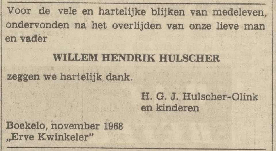 Hulscher W.H. Kwinkelerweg 20 advertentie 9-11-1968