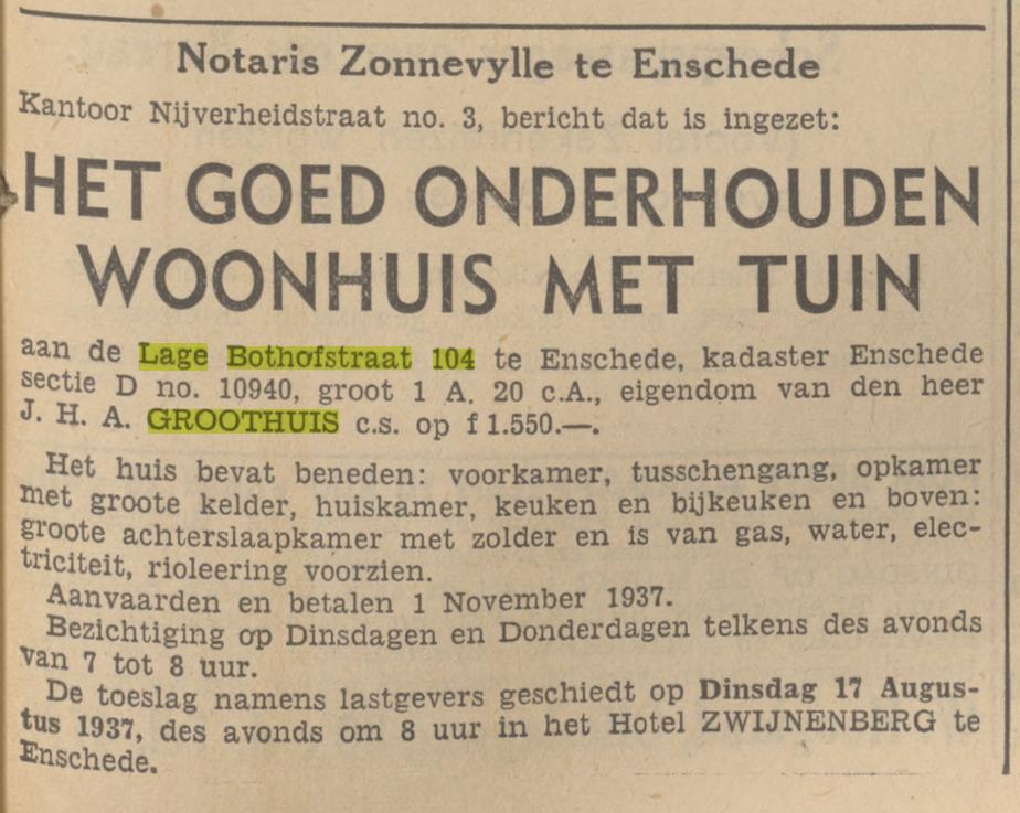 Groothuis J.H.A. textielarbeider Lage Bothofstraat 104 advertentie 14-8-1937