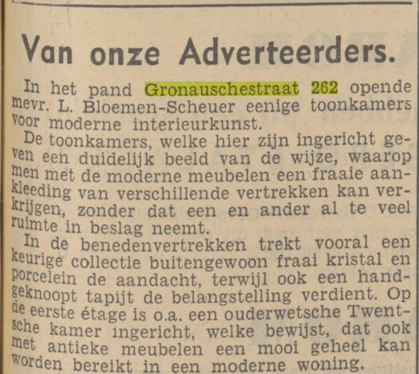 Bloemen-Scheuer Mevr. L. Het Binnenhuis Interieurkunst Gronausestraat 262 krantenbericht 12-11-1936