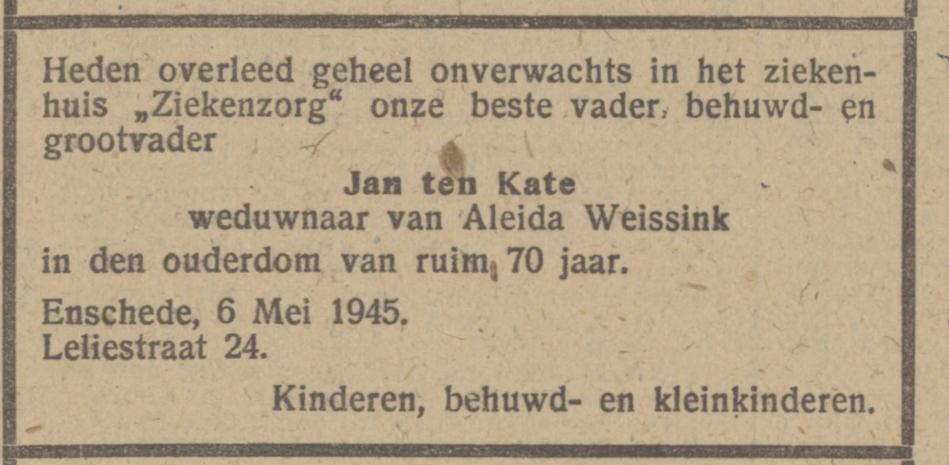 Leliestraat 24 Jan ten Kate overlijdensadvertentie Het Parool 11-5-1945.jpg
