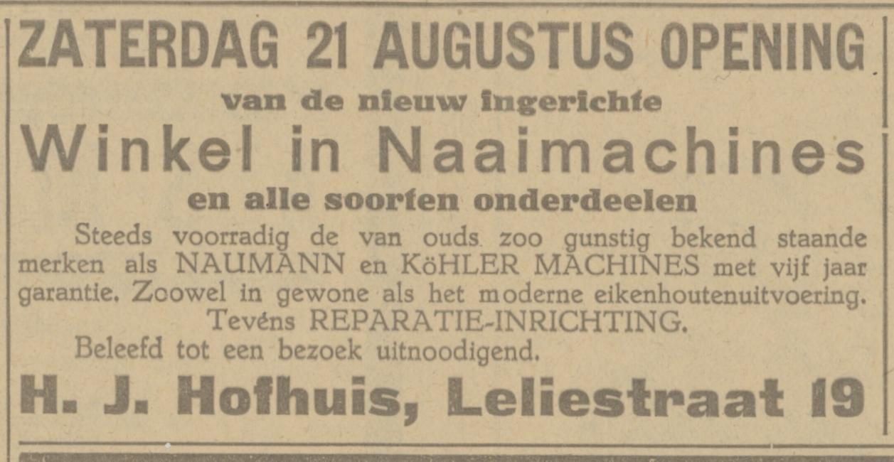 Hofhuis H.J. naaimachinehandel Leliestraat 19 advertentie 20-8-1926