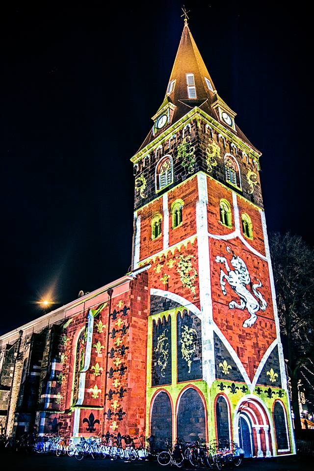 Hierbij alvast een voorproefje van de lichtprojectie op de Grote Kerk aan de Oude Markt. Gezien op Facebook van Enschede Stad van Nu.