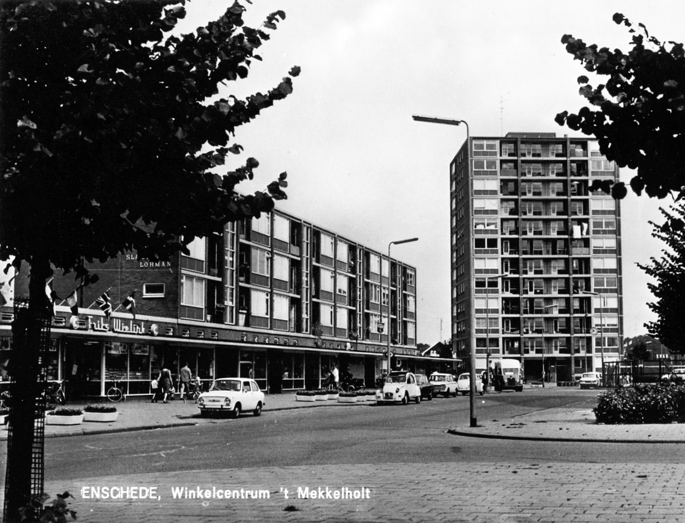 Fazantstraat Winkelcentrum 't Mekkelholt gezien vanuit zuidelijke richting met torenflat. Zichtbaar is o.a. de winkel van Frits Wielink slagerij Lohman.