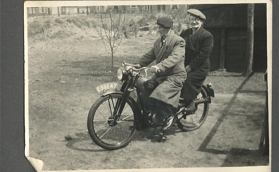 Mooi plaatje Pieter. Doet mij denken aan de motor die mijn vader vroeger had. Maar op onderstaaande foto (waar mijn opa en oma voor de grap op de moter zijn gaan zitten, ziet die motor er toch anders uit. Ik weet wat voor merk het is geweest.