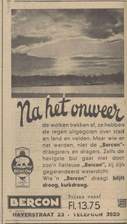 In 1936 waren er rond deze tijd ook al vele regenbuien met onweer. vandaar deze advertentie: Haverstraat 23 Bercon Twentsch dagblad Tubantia en Enschedesche courant. Enschede, 19-05-1936.