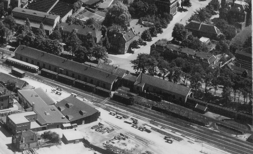 Het was even zoeken. Als je goed kijkt is op onderstaande luchtfoto uit 1945 de draaischijf te zien.