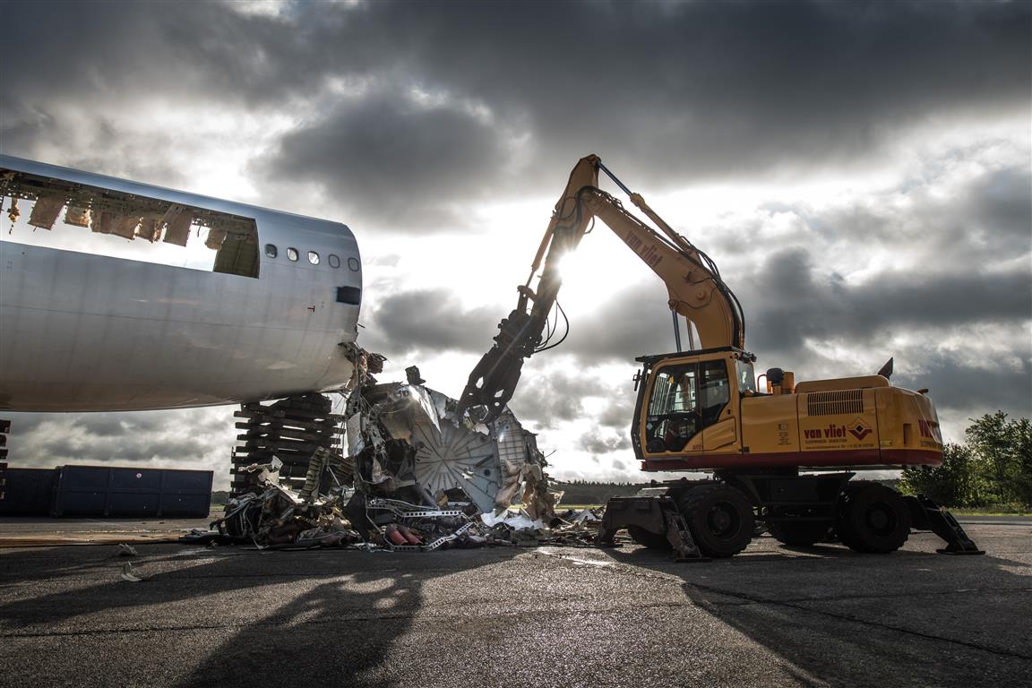 Airbus op Twente Airport door grote grijper in stukken geknipt