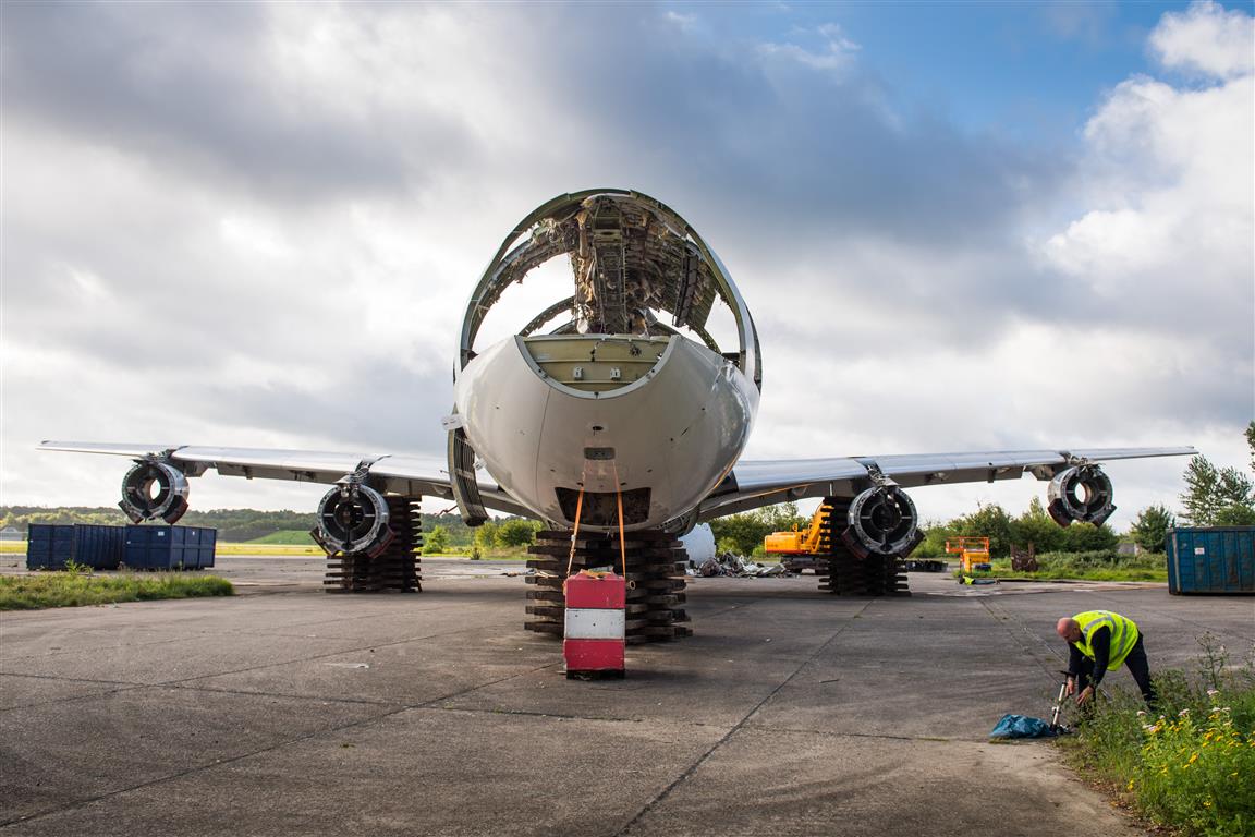De lege romp van het vroegere intercontinentale passagierstoestel werd nog slechts overeind gehouden door opgestapelde spoorbielzen. De cockpit en de staart van het vliegtuig waren al in een eerder stadium verwijderd. Een en ander was het resultaat van een knipbeurt van het toestel door een grote grijper, wat met een oorverdovend lawaai gepaard ging.