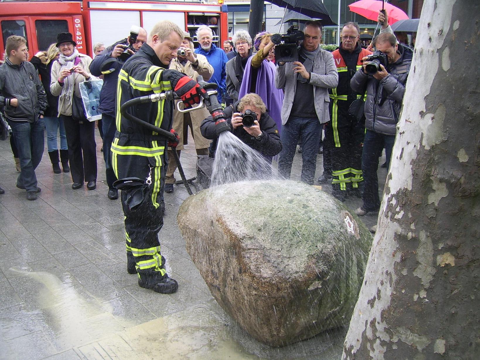 Onthulling van de gedenksteen op het H.J. van Heekplein door voorzitter Buursink van Stichting Historische Societeit Enschede Lonneker. De burgemeester was hierbij ook aanwezig. De brandweer van Enschede verleende haar medewerking door de gedenksteen nat te spuiten. De originele gevelsteen ligt nu in Museum Twentse Welle en zat vroeger aan het huis aan de Kalanderstraat, waar de brand in 1862 is ontstaan, ongeveer op de plek waar nu de gedenksteen is onthuld.