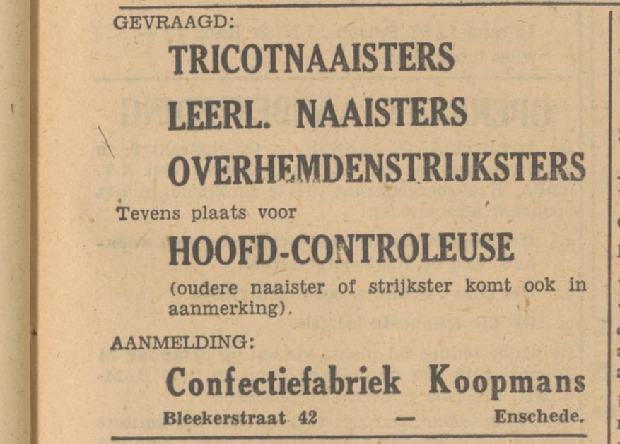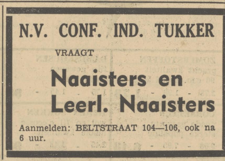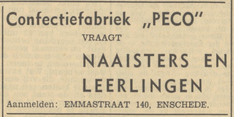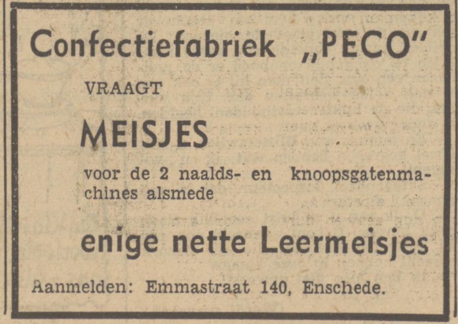 Ik heb van deze confectiefabriek geen afbeelding kunnen vinden. Het kantoor was gevestigd aan de Emmastraat 21 volgens onderstaande advertentie van 10-10-1947.