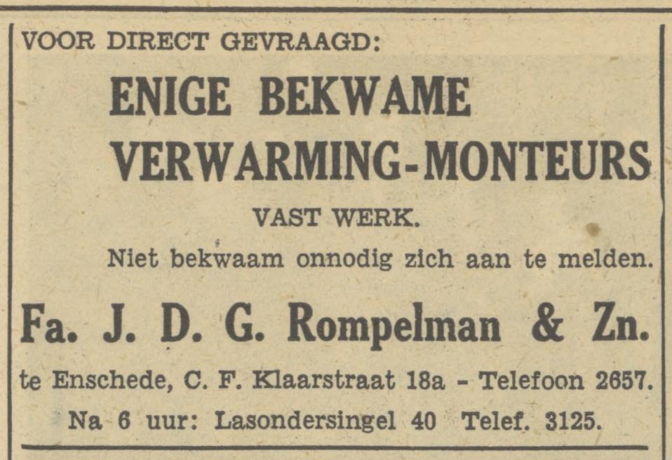Rompelman J.D.Gr. centrale verwarming en loodgietersbedrijf C.F. Klaarstraat 18 a advertentie 11-1-1950 voorheen Getfertstraat 18a advertentie 5-9-1932