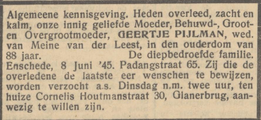 Cornelis Houtmanstraat 30 Wed. G. van der Leest-Pijlman overlijdensadvertentie Het Parool 11-6-1945.jpg