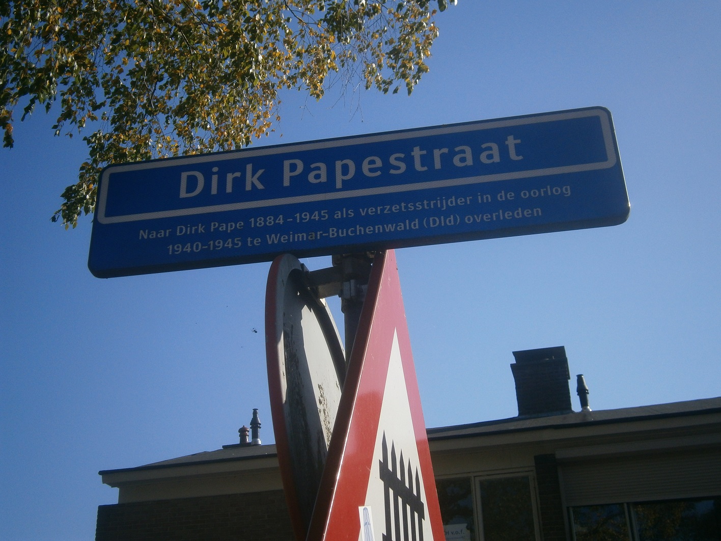 Naar Dirk Pape, geboren 13 mei 1884 te Ambt-Hardenberg, als verzetsstrijder in de 2e Wereldoorlog 1940-1945 op 8 maart 1945 te Weimar Buchenwald (Duitsland) overleden. Hij was in zijn functie als directeur van de Boekelose Coöperatieve Stoomzuivelfabriek van 1920 tot aan zijn overlijden zeer gezien en de adviseur van de landbouwers in deze omgeving (4 april 1955). Deze straat maakte voordien deel uit van de Weleweg. bron: http://straatnamen.enschede.nl/straten/00318/?char=D