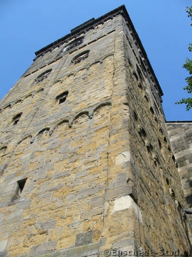 TOREN der Ned. Herv. Kerk. Tegen het midden van de 13e eeuw werd de zware laat-romaanse zandstenen toren aan de kerk toegevoegd. In 1480, bij de vergroting van de kerk verhoogd. Bij herstelling na de brand van 1862 kreeg de toren een achtkantige lantaarn, die bij de restauratie in 1926/28 plaats maakte voor de huidige spits, terwijl de onderbouw grotendeels vernieuwd werd. De toren heeft een vrij rijk behandelde boogingang. Op de eerste verdieping zijn sporen gevonden van een gewelfde torenkapel. In de vierde geleding vernieuwde twee- en driedelige romano-gotische galmgaten. In de muur van de kerk is een stenen zonnewijzer, 1836, ingemetseld. Eronder een tijdvereffeningslus met datumaanwijzing. Daaronder op een aparte steen staat een gedicht in een chronogram voor het jaartal 1936. Gerestaureerd 1991. Trommelspeelwerk van Van Bergen, 1951. bron: http://rijksmonumenten.nl/monument/1530 ... /enschede/