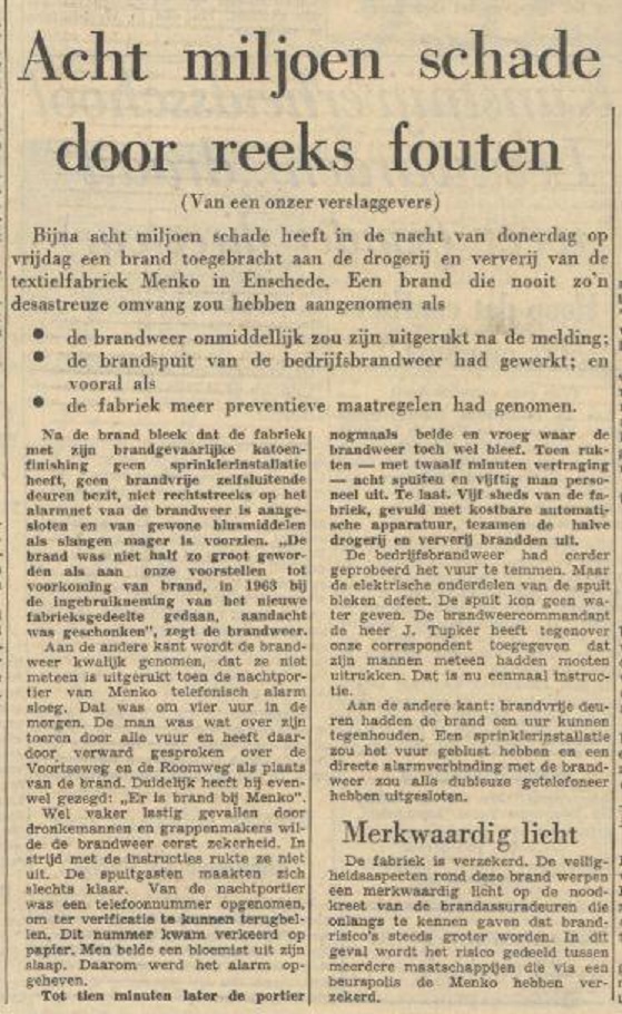 Roomweg brand textielfabriek Menko. krantenbericht Trouw 7-11-1964