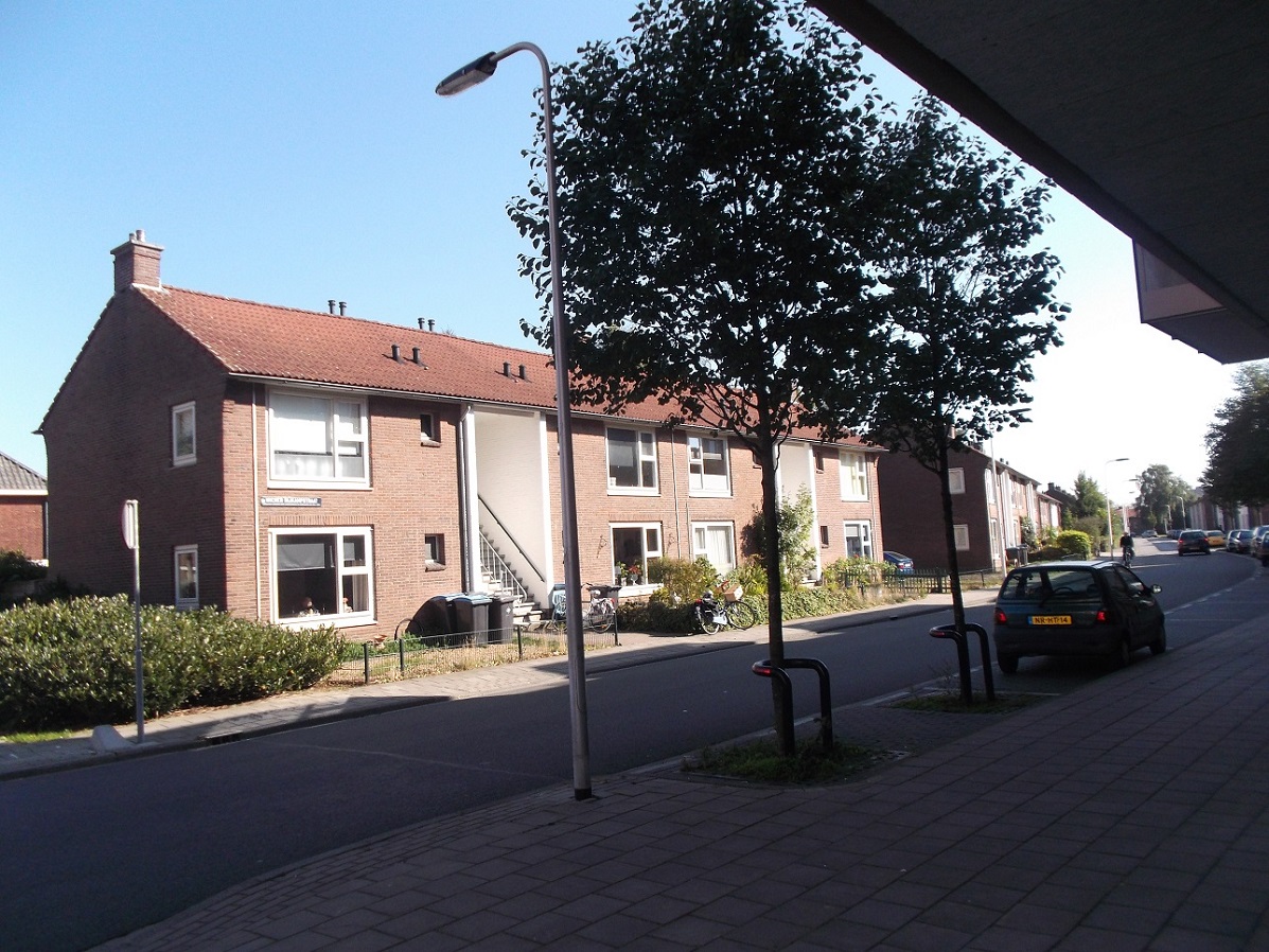 En ook die van het sigarenmagazijn heb ik gemist. Die zaak was van een weduwe Oldenjans, ernaast zat een soort van leesbibliotheekje. De deur ervan zit op de nieuwe foto achter de container. Ik heb daar heel wat boeken weggehaald en gelezen, Willy van der Heide, Bas Banning, Jan Ligthart (Frank Distel) koiboiboekies van Tuttle, Max Brand, Jackson Cole, en Scott, en avonturenromans van A.L. van Kersen (Multon onder andere). Ik was alleen te jong voor de “literatuur” die onder de toonbank lag. Niet zo heel nette boekjes om het zachtjes uit te drukken. Maar mijn grootmoeder las die welArie schreef:Poolmansweg hoek Kastanjestraat in 1954 sigarenwinkel en in 2013 cafetaria