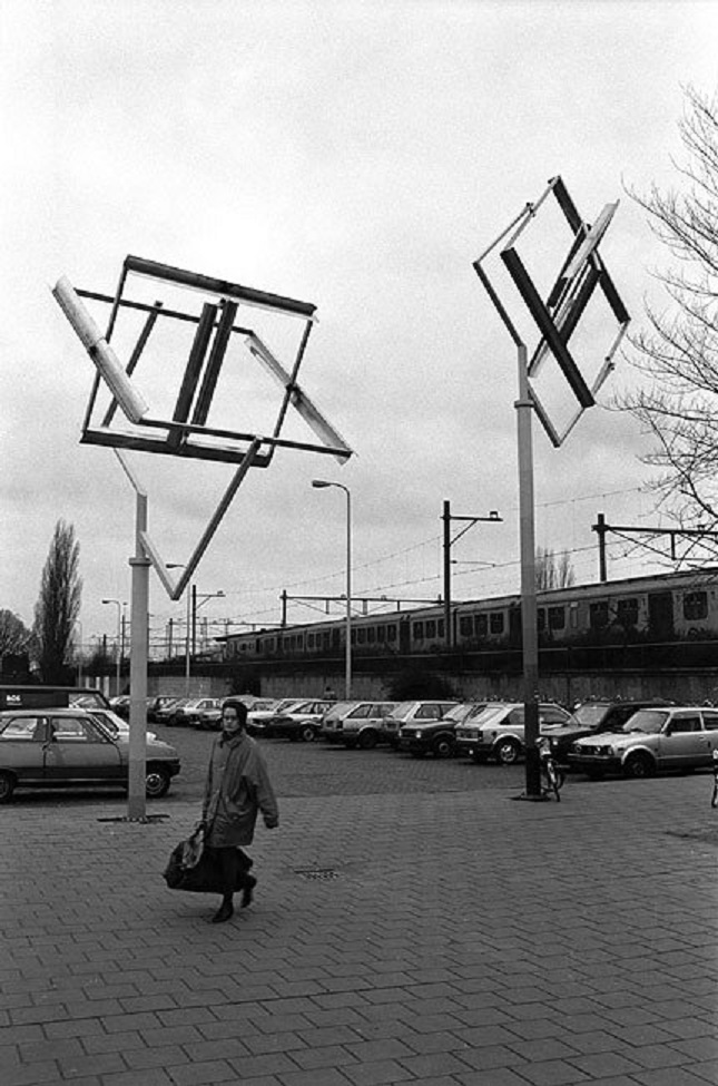 Boulevard kunstobject Excalibur Pretending, twee windobjecten van in elkaar draaiende vierkanten van kunstenaar Alwie Oude Aarninkhof. Dit kunstwerk stond vroeger aan het Stationplein. zie ook: http://www.twentejournaal.nl/enschedeaa ... revisited/