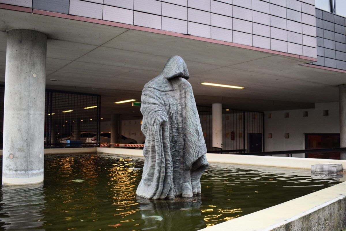 Het beeld is een figuur met een kap lijkt op een monnik. Dit beeld staat in het water, naast de ingang van de parkeergarage van het belastingkantoor in Enschede. Bij het beeld staat helaas geen bordje met informatie over de kunstenaar of de naam van het kunstwerk.
