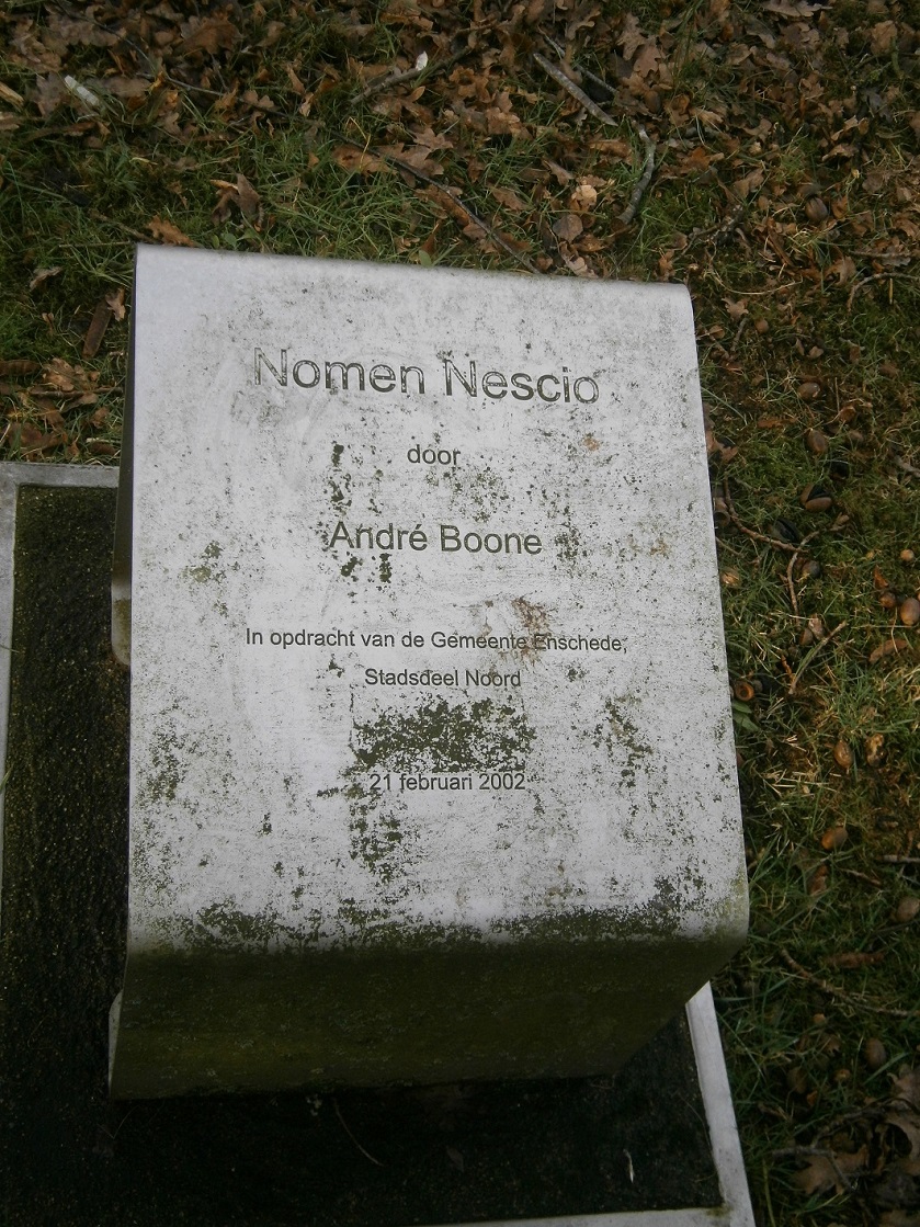Deze opdracht is gerealiseerd in het kader van het ’KunstZinnig’ project, een serie kunstopdrachten in Enschede geïnitieerd door het Innovatief Centrum voor Kunstenaars (ICK) waarbij Enschedese kunstenaars worden ingezet om de kwaliteit van de leefomgeving te verhogen. Dit beeld is gemaakt naar aanleiding van de vuurwerkramp van 13 mei 2000. Het heet ’Nomen Nescio’ en dat betekent ’Ik weet de naam niet’. De kunstenaar zegt over dit beeld het volgende: "Ik stel mij voor dat mensen vlak voor de ramp gezellig buiten een kopje koffie of thee dronken. De ontploffingen verstoren dit vredige tafereel. Het servies valt om. Mensen vluchten weg maar het kopje blijft omgevallen liggen. De volgende dag is de vogel op het kopje de eerste die terugkeert naar zijn woonstede. De vogel laat zien dat de natuur kort na de ramp weer bezit neemt van de plek. De tijd, het leven gaat door. Er is geen stilstand. Ook nu is er de dag erna, met zijn eigen dynamiek." "Een gebeurtenis als de vuurwerkramp is zeer ingrijpend. Mensen worden plotseling uit hun leven van alledag gerukt. Dat ene moment, die overgang tussen het leven van alledag en het plotseling daaruit weggerukt zijn, is ongrijpbaar en niet in woorden uit te drukken. ‘Nomen Nescio’: Ik weet de naam niet." bron: http://www.kunstnonstop.nl/collectie/de ... nK-ifniWmw