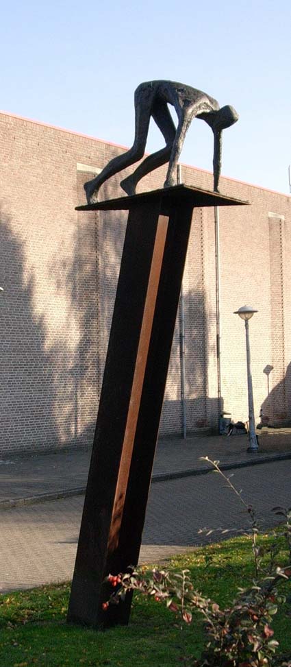 Cees Willemsen is opgeleid aan de dag- en avondschool van de AKI in Enschede en aan de Rijksacademie in Amsterdam. Begin jaren tachtig kwam hij terug naar zijn geboortestreek Twente. Hij maakt beelden waarvan hij vindt dat die voor zichzelf spreken. Dit beeld van een in de startblokken staande man staat tegenover een sporthal en dat zegt eigenlijk genoeg. bron: http://www.kunstnonstop.nl/collectie/de ... n68Nvnemmw