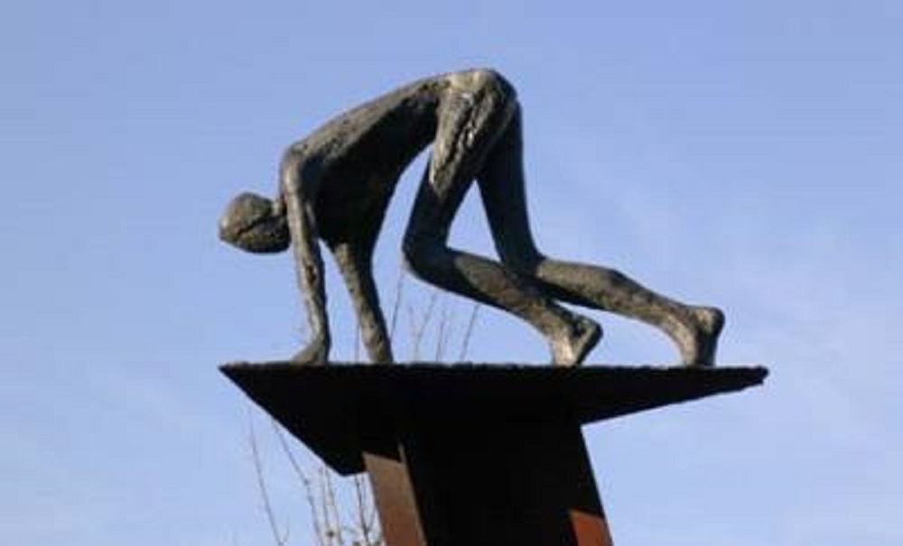 Beeld van man in starthouding. Het bronzen beeld staat op een zuil van cortenstaal, de zuil is 350 cm. hoog.