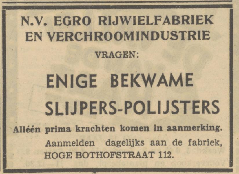 E.G.R.O., N.V. Rijwielfabr. en grooth., Hoge Bothofstraat 112 (kant.u. 8 ½ - 12 en 13 – 17 ½, Zat. 8 ½ - 12 ½).