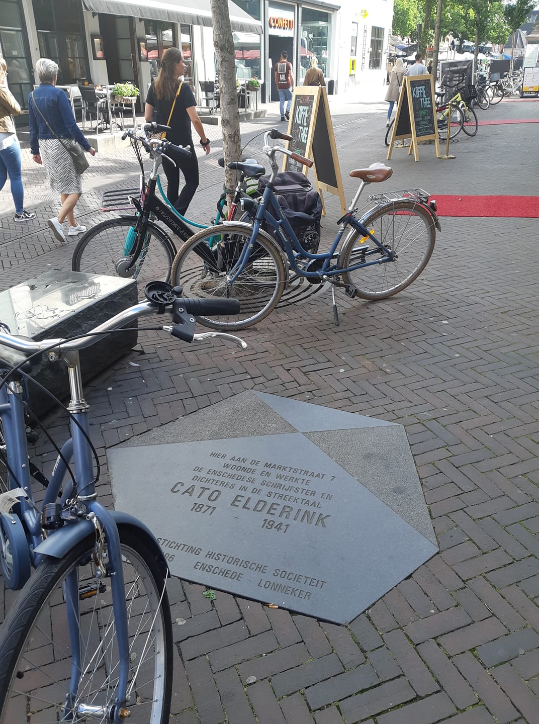 Ik ben er vandaag nog even langsgefietst. De herinneringstegel aan Cato Elderink ligt dus nog wel voor het pand Marktstraat 7.