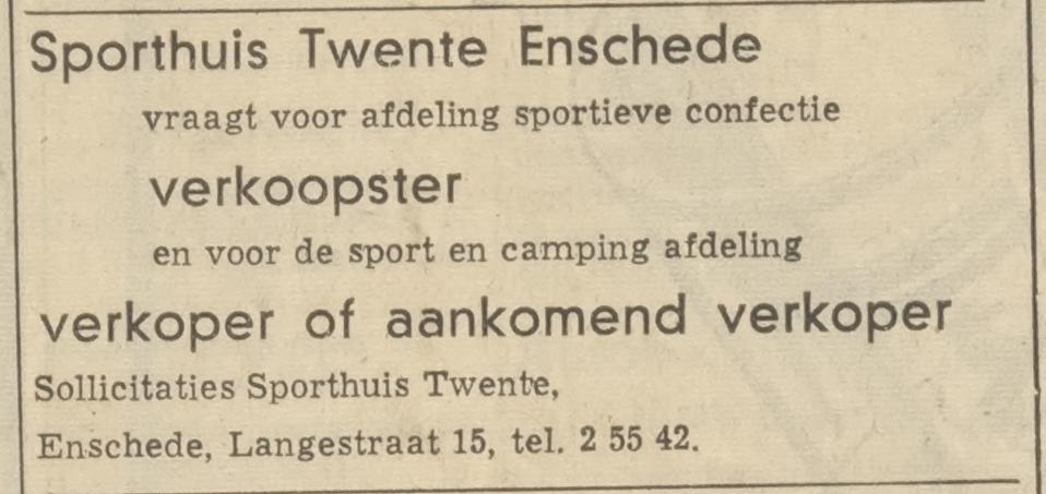 Langestraat 15 Sporthuis Twente advertentie Tubantia 6-5-1969