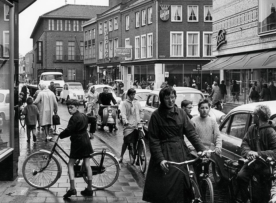 Mooie foto, Arie. Dames met hoofddoek, scooterrijder zonder helm, nog een Haverstraat in plaats van een passage, en de idioterie van autoluwe binnenstad heeft ook nog niet toegeslagen. Plus een verzopen kat in trui rechtsonder (had ik kunnen zijn, ik vergat ook altijd mijn jas) en volgens mijn een Bedford truck op de achtergrond. En iedereen maar wachten tot het licht bij de Hema groen wil worden…