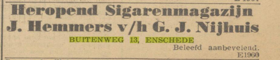 Buitenweg 13 sigarenmagazijn J. Hemmers vh G.J. Nijhuis Advertentie. Trouw. Enschede, 28-09-1945.