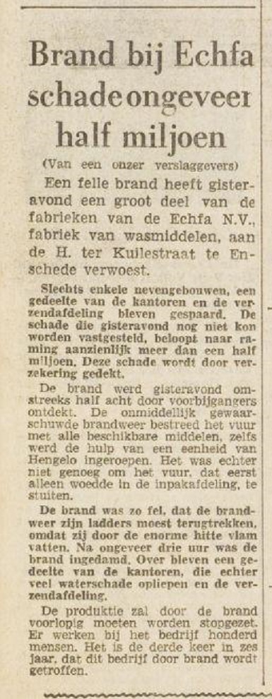 Enkele voorwerpen (o.m. een speldje) en een advertentie van de Echfa N.V., fabriek van wasmiddelen uit Enschede. Deze fabriek stond aan de H. ter Kuilestraat bij de Haven. Volgens onderstaand krantenbericht van 1-4-1957 is daar 61 jaar geleden een grote brand geweest. Ik kan mij dat nog herinneren, want ik ben er toen samen met mijn vader wezen kijken.