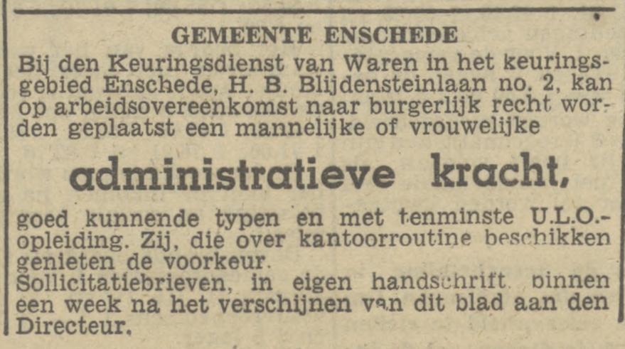 Het voormalige pand van de Keuringsdienst van Waren aan de Blijdensteinlaan is opgetrokken in een expressionistische baksteenarchitectuur, verwant aan de Amsterdamse School. Het pand is in 1923 gebouwd en is waarschijnlijk ontworpen door de toenmalige directeur gemeentewerken van Enschede, de heer H.G. Mos. Het gebouw bood plaats aan een laboratorium waar destijds het voedsel voor de bevolking van Enschede werd gekeurd.