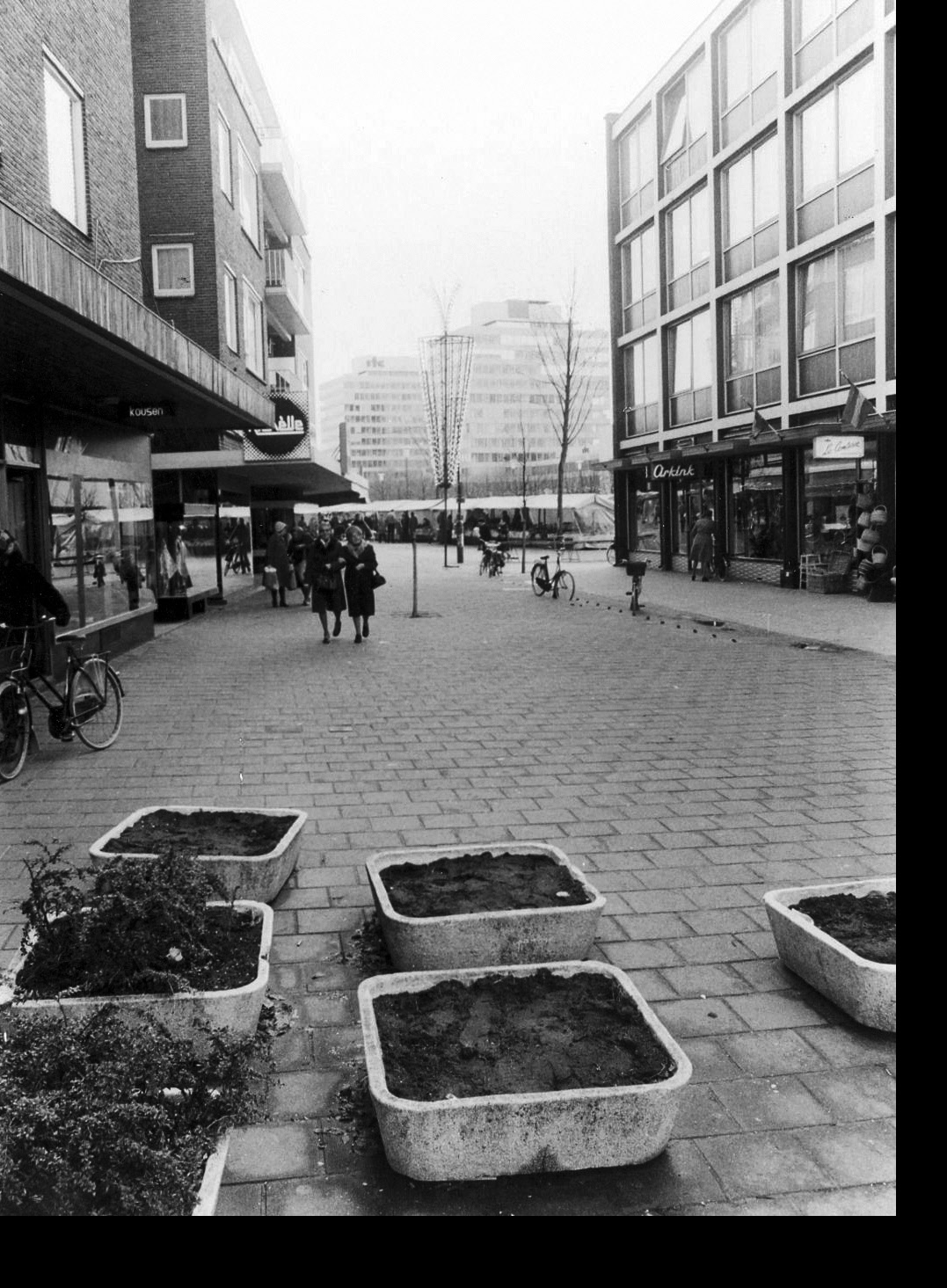 Van Loenshof 1-5 vanaf de kruising met de Langestraat. Winkels van Woudstra en Bervoets-Vriezelaar, Het Broekenhuis. Verderop zijn ook noodwinkels zichtbaar. jaren 70.jpeg