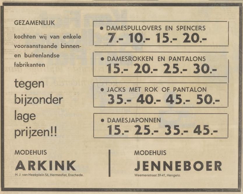 H.J. van Heekplein 56 hoek van Loenshof Hermesflat Modehuis Arkink advertentie Tubantia 18-6-1973