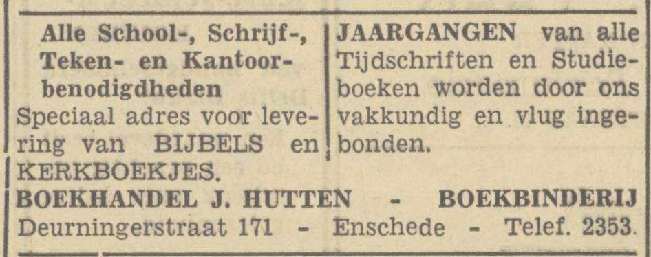 Hutten J. boekh., boekb. Deurningerstraat 171 advertentie 25-10-1949