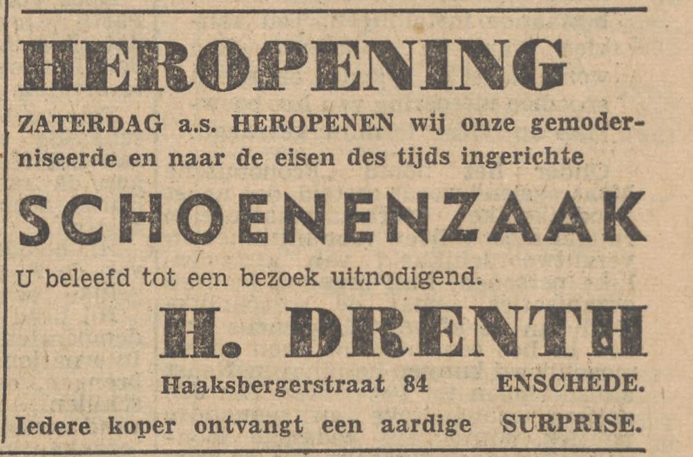 Haaksbergerstraat 84 schoenenzaak H. Drenth advertentie Tubantia 26-9-1952.