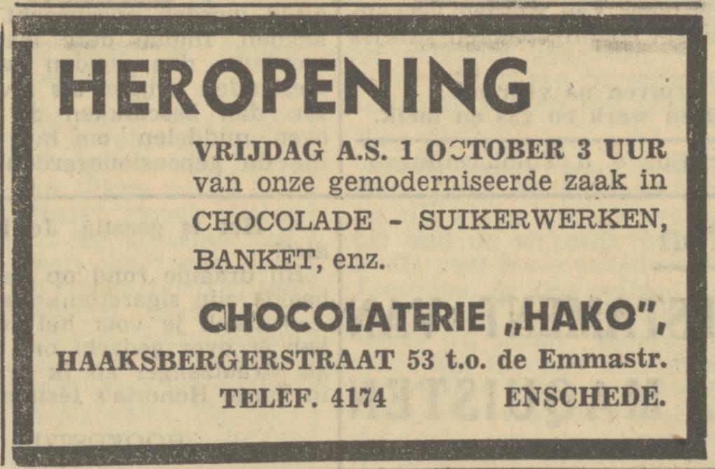 Haaksbergerstraat 53 Banket Chocolaterie Hako advertentie Tubantia 30-9-1948