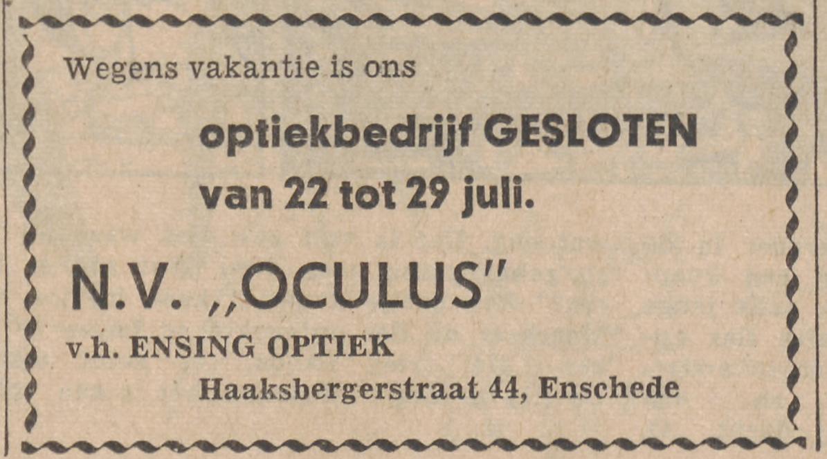 Haaksbergerstraat 44 optiekbedrijf N.V. Oculus v.h. Ensing Optiek advertentie Tubantia 20-7-1963.