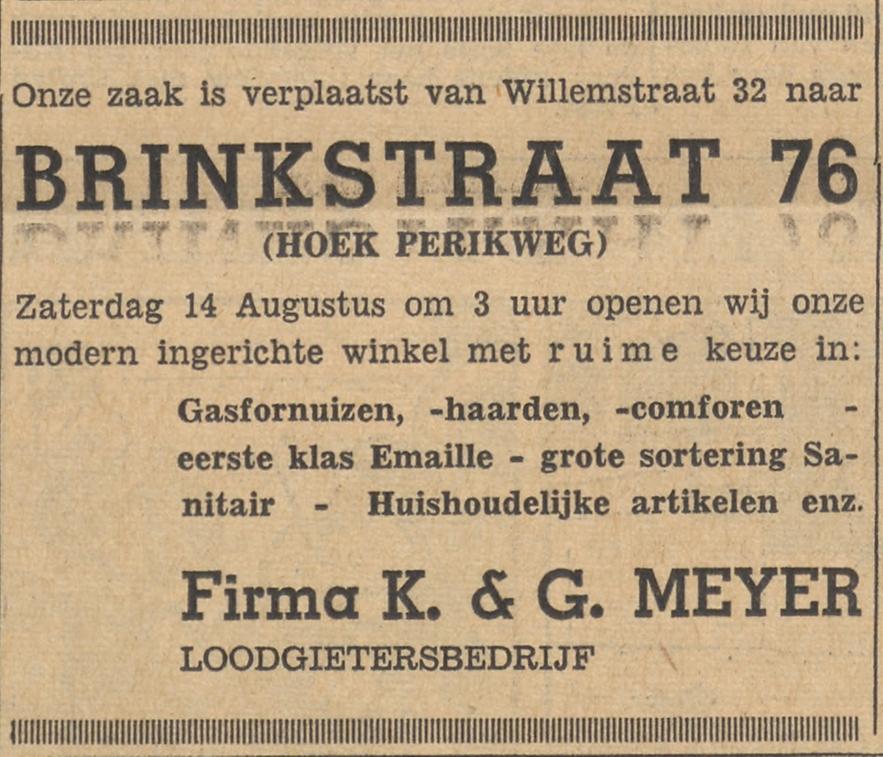 Brinkstraat 76 hoek Perikweg loodgietersbedrijf Firma K. & G. Meyer advertentie Tubantia 13-8-1954