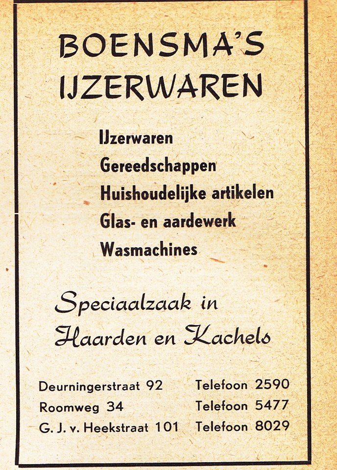 Mooi artikel over de historie van de winkels van Boensma Ijzerwaren die aan de Deurningerstraat en Roomweg hebben gezeten en nu nog is gevestigd aan de G.J. van Heekstraat 101-103. Van de winkel aan de Roomweg heb ik geen foto kunnen vinden.