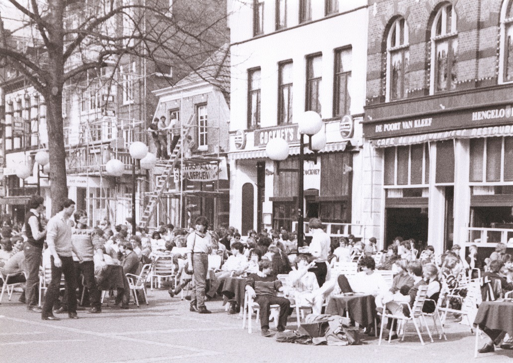 Markt 10-16 hotel Atlanta, café De Pimpelaar en Concordia. Achter de muurtjes op de voorgrond en de telefooncel zit het Gat in de Markt, destijds een openbaar toilet, later een studentenclublokaal 24-4-1980.jpeg (203 KiB) 4148 keer bekeken