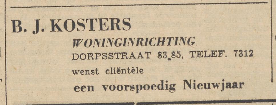 Kosters B.Joh. meubelmaker Dorpsstraat 85 advertentie 31-12-1956 en 6-6-1962