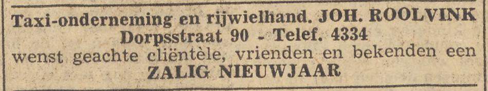 Dorpsstraat 90 taxionderneming en rijwielhandel Joh. Roolvink advertentie Twentsche Courant 31-12-1958.jpg